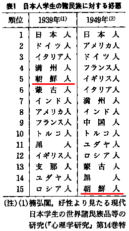 まずは、戦後日本人の韓国(朝鮮)や韓国(朝鮮)人に対するイメージのおおまかな変化を把握するために、世論調査の結果を概観してみることにする。表1は、楠弘閣が1939年と1949年に行った「日本人学生」の「諸民族」に対する好悪調査の結果を、鈴木二郎が整理したものである。同調査は、戦前から戦後にかけての朝鮮人イメージの変化をうかがうことのできる貴重な資料であるが、印象的なのは、39年調査で、比較的好感度の高い集団として位置づけられていた朝鮮人が、49年調査では、最も好感度の低い集団に転落しているということである。 なぜなのだろうか。多分、重要なのは、日本人がかつて朝鮮人との間に共有していた運命共同性の消失と戦後の日本社会における在日朝鮮人の行為という二つの要因であろう。「内鮮一体」や「内鮮融和」のスローガンが示すように、39年当時の日本人にとって、朝鮮は「大日本帝国」の版図の一部であり、32年満州国建国、37年日中戦争へと時局が推移する過程で、その国策的要請は高まっていた。 敗戦後、こうした運命共同性が消失した時、朝鮮人に対する眺めが変化したのは当然のことであるが、好感度がかくも急激に下落したのは、終戦直後の在日朝鮮人の行為が日本人の心に植え付けた印象であろう。 (*終戦は1945年) |