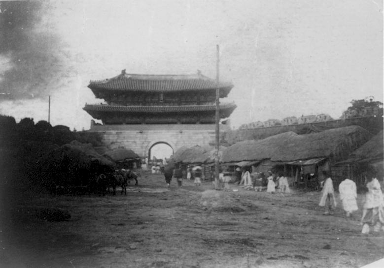 | 撮影年度は不明であるが、江華島条約で朝鮮が開国したのが1876年だからそれ以降であろう。首都ソウルは市内が城壁で囲まれた囲郭都市で、南大門はソウル四大門の一つで20万都市の正門であった。王宮へ向かう大通りに沿って粗末な藁葺き屋根の家が建ち並び、衰退した国力を物語るような町並みが広がっていた。 |