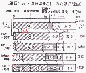 | 農家を相続できない次男三男が仕事を求めて日本に渡って来たというのは、在日1世の平均渡日年齢が19.1歳と非常に若いことからも推測できる。 | |||||||||||||||||||||