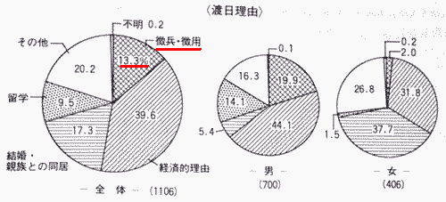 | これによると、大部分は本人の自発的な意思で渡日したもので、いわゆる"強制連行"が原因で日本に住みついた人は全体の13.3%しかいないことが分かります。しかし早い時期に渡日した人はすでに亡くなっていること、また家族の一員として渡って来た12歳未満の子供は含まれていないので割合はこれより下がります。さらに戦後渡ってきた者(密航?)を含めるとさらに低下します。 |